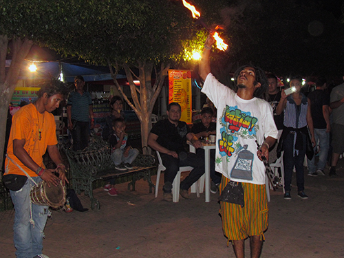 Desde entonces, Gustavo, originario de Tecún Umán, departamento fronterizo entre Guatemala y México, Bryan originario de Santa Ana, El Salvador, y otros tres miembros del grupo hacen malabares con antorchas y otro tipo de instrumentos, acompañados de un timbé, una especie de tambor de origen africano.