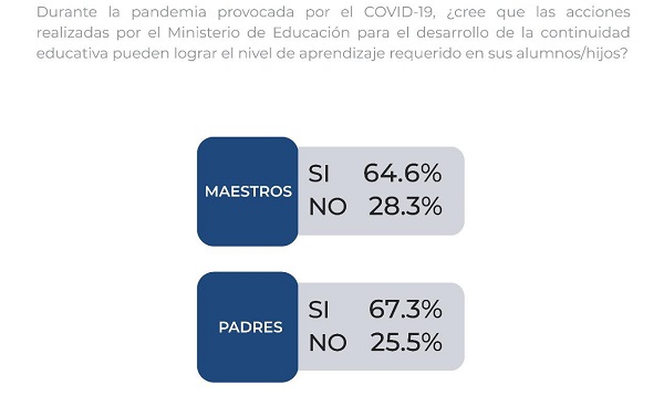 Esos mismos grupos evaluaron las acciones que realizó el Ministerio de Educación para dar continuidad educativa y atender a la población estudiantil ante la crisis que generó la COVID-19, el 97.6% de docentes evaluaron dichas acciones entre excelente, muy bueno y bueno, mientras que los padres de familia las evaluaron con el 92.3%.