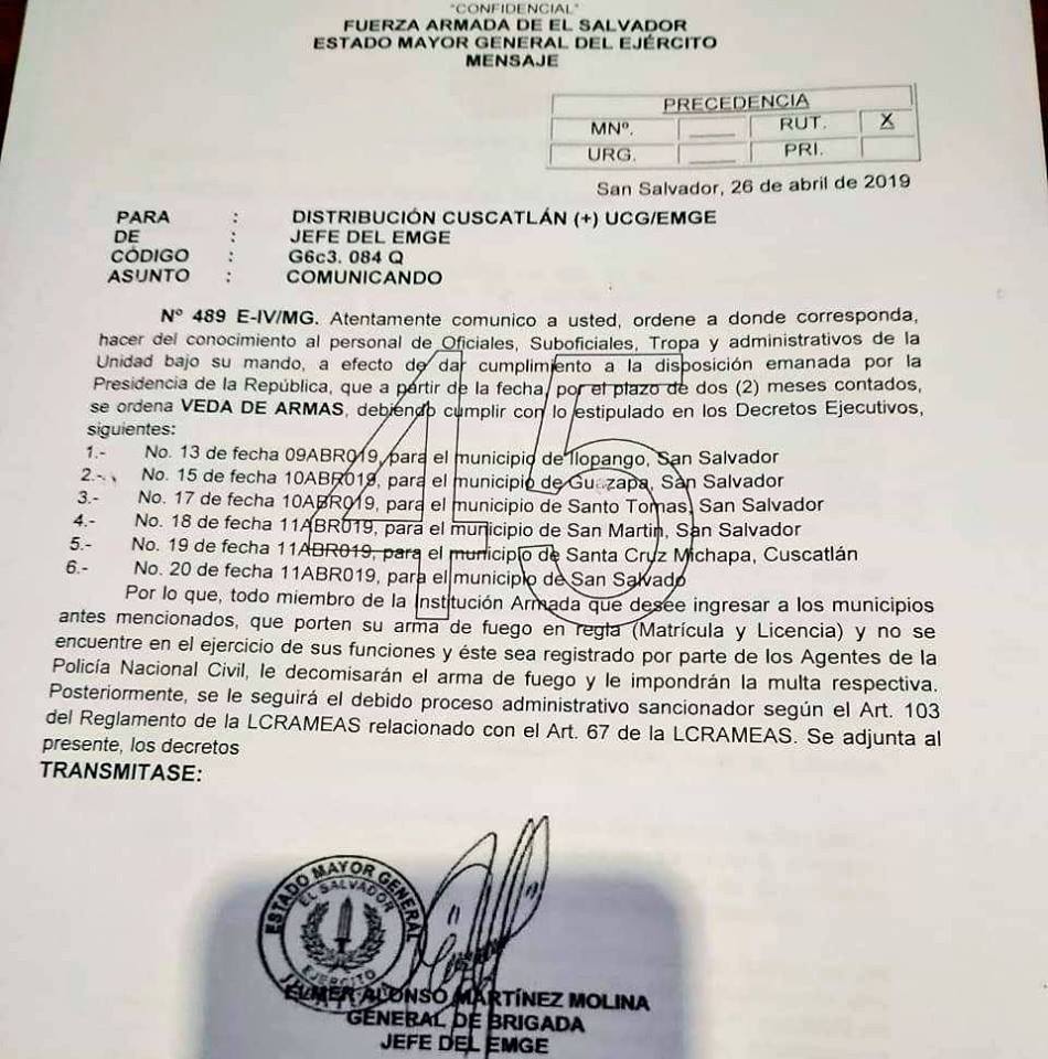 “Todo miembro de la institución armada que desee ingresar a los municipios antes mencionados que porten su arma de fuego en regla (Matrícula y Licencia) y no se encuentre en el ejercicio de sus funciones, y este sea registrado por agentes de la Policía Nacional Civil le decomisarán el arma de fuego y le impondrán la multa respectiva”.