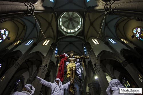 Jesús muere en la cruz. Los servidores del Santo Entierro de la Iglesia El Calvario, en San Salvador, cumplen después de los oficios de las 3:00 p.m. donde se alaba a Cristo y se bendice porque por tu Santa Cruz redimiste al mundo.