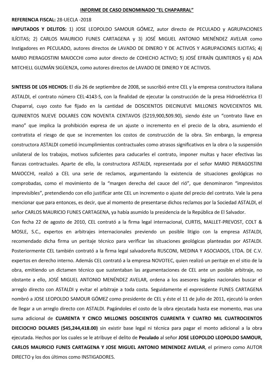 Se trata del caso de la construcción de la presa El Chaparral, cuyo costo se incrementó debido a un mal manejo de la inversión que involucraría, según la Fiscalía General de la República, a Funes y la empresa italiana ASTALDI.