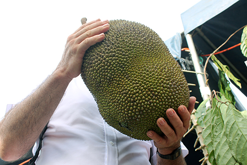 Su forma de gato erizado le ha valido para que esta enorme fruta que llega a pesar hasta diez libras o más, sea bautizada en Occidente como la Fruta Gato («Juck Fruit) o más curiosamente como la Fruta de los siete sabores. También se la conoce como jacka.
