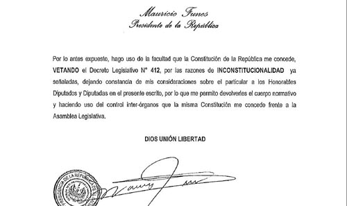 Argumentando violación a tres principios constitucionales, el Presidente de la República, Mauricio Funes, vetó la tarde de este lunes el decreto 412, mediante el cual los diputados pretendían evitar propaganda que desprestigiara a los candidatos a la Presidencia y Vicepresidencia de la República.