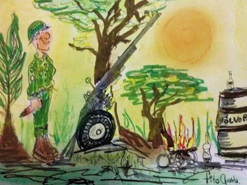 Se presentó voluntario a la primera brigada de artillería Tte. Coronel: “Armando Cuchillas del Cañón”, ahí pasó año y medio, hasta que salió con una maleta de cuero de cerdo, una foto abrazando una ametralladora; más sereno y respetuoso.