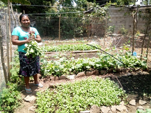 “Cosecho pepinos, cilantro, cebollín y hasta vendo porque no lo alcanzamos a consumir todo”, explica Gloria Nohemí Ramírez, beneficiaria del proyecto en Ciudad Arce.