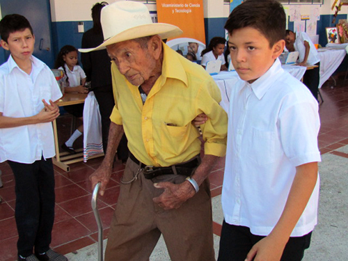 Un hombre de avanzada edad llegó lento al Centro Escolar Dr. Adrián García y fue abordado por dos alumnos de la escuela para ayudarlo a llegar hasta las sillas y sentarlo. Era un invitado de la comunidad que llegó a presenciar los actos de inauguración del año escolar.