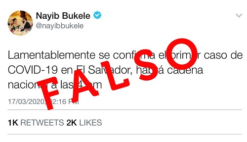 Desde una cuenta falsa creada con el perfil de la cuenta de Twitter del Presidente Nayib Bukele, se informó este martes que se había dado el primer caso de coronavirus y que por ello se daría una cadena de radio y televisión a las 4:00 p.m.