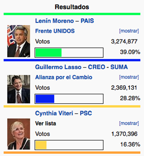 Internacional. Lenin Moreno, encabeza los resultados de las elecciones celebradas en Ecuador con el 39,09 % de los votos, luego del escrutinio del 87 %, aventajando en un poco más  de un 10 % a su opositor Guillermo Lasso, quien ha alcanzado el 28.28 %.