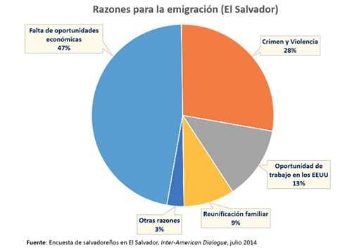 Uno de cada cuatro salvadoreños -principalmente hombres jóvenes- son los más interesados en migrar a otro país por culpa de la violencia e inseguridad. Según encuestas realizadas en el último año, los salvadoreños perciben a la falta de oportunidades económicas como el impulsor más importante e inmediato de la migración de sus conciudadanos, representando el 47% de las respuestas.