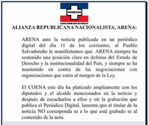 Sin embargo, en un comunicado oficial divulgado por el partido Alianza Republicana Nacionalista (ARENA), en el que se cuida de no mencionar a sus miembros involucrados en este hecho, el instituto niega que se haya llevado a cabo tal negociación.