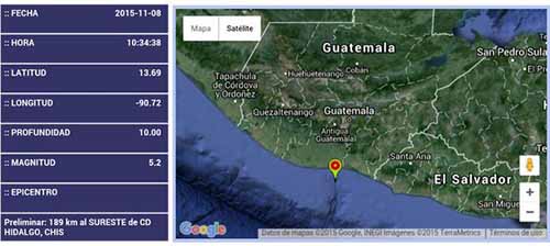 A las 10:34 de este domingo 8 de noviembre, un temblor sacudió la costa guatemalteca, en el Océano Pacífico informó el Ministerio de Medio Ambiente y Recursos Naturales de El Salvador (MARN). El movimiento que tuvo una profundidad de 45.0 Km. y una magnitud de 5 grados, fue sensible en San Salvador. Sin embargo, la Coordinadora Nacional para la Reducción de Desastres (Conred), de Guatemala, dijo que la magnitud fue de 4.5 grados, aunque inicialmente la cifró en 5.2 grados y que el mismo se ubicó frente a las costas de Escuintla.