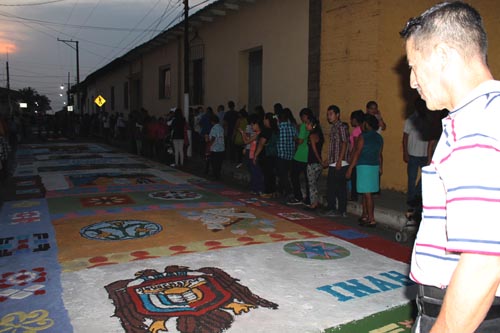 José Armando Escalante Martínez, profesor de inglés encargado del grupo de estudiantes que cada año participa en la elaboración de una alfombra para el paso de la procesión con el Cristo fallecido después del escarnio, explicó que después de hacer la alfombra, los alumnos en la materia “Creatividad” inician la elaboración de los dibujos. La materia “va dirigida a Monseñor Romero” comenta el docente.