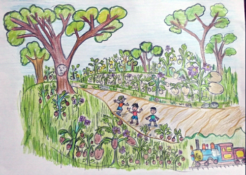 Llegaron al sector de flores. Todos los arbustos tenían múltiples flores violáceas que en combinación con el verde daban a los ojos infantiles de los visitantes, una sensación de belleza pocas veces apreciada. Continuaron caminando y vieron que de las pequeñas florecitas violáceas brotaba un fruto blanquecino, pálido y a medida que seguían caminando se iban haciendo más grandes hasta tomar la forma de huevos.