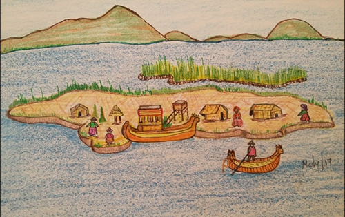 La primera impresión no fue muy agradable, pues el tan esperado Titicaca se veía contaminado, sucio con mucha vegetación en su superficie. Ahí abordaron con un grupo de personas una pequeña embarcación que los conduciría a las famosas islas flotantes de los Uros. Después de una hora de viaje entre canales bordeados por una planta acuática llamada Totora, por fin arribaron a una de las tantas islas.
