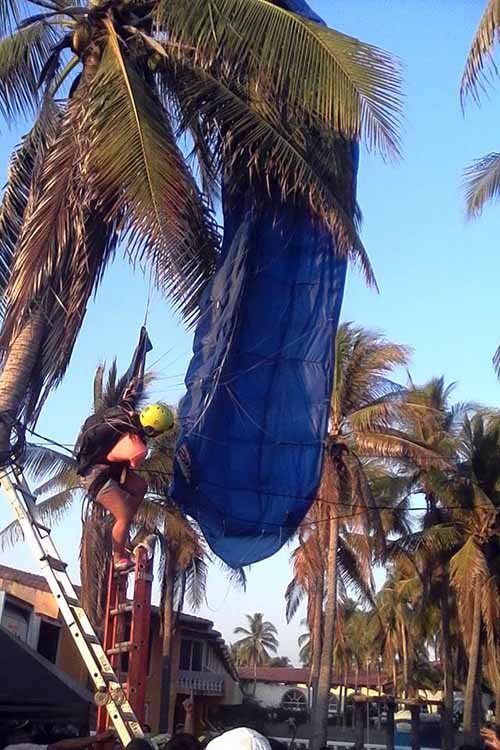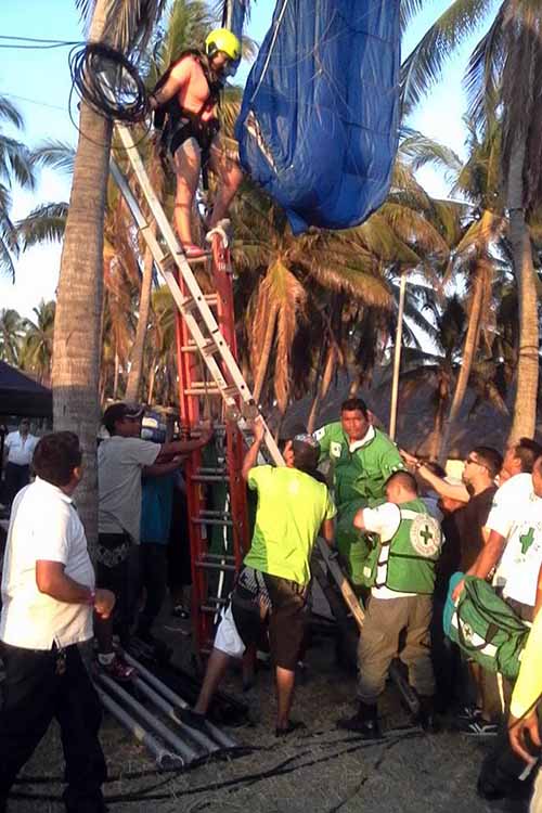 Una joven paracaidista que participaba en un show, como parte de un evento en un hotel de la playa Costa del Sol, en La Paz, se salvó de morir, de milagro, luego que cayera en la copa de un cocotero la tarde del Jueves Santo. Una ráfaga habría desviado el trayecto de la paracaidista y al quedar ensamblada en las palmas del árbol se salvó de morir, según algunos testigos que presenciaron el hecho. Unidades de Cruz Verde Salvadoreña acudieron en auxilio de la joven y la ayudaron a descender con escaleras.